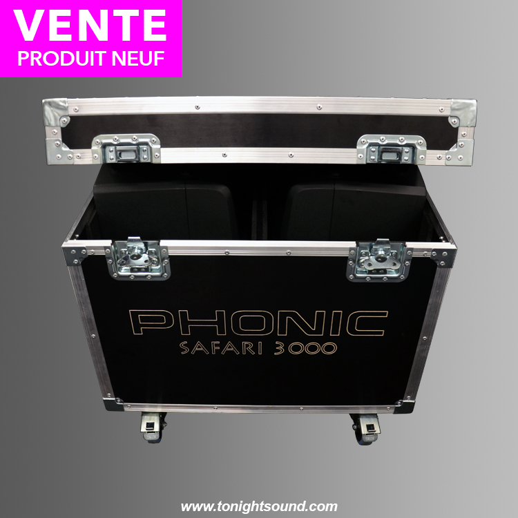 Flight case Phonic Safari : Flight-case professionnel Haut-de-gamme pour le conditionnement de deux enceintes Phonic Safari 3000 actives ou passives, et leurs accessoires. Fabriqué en France.
